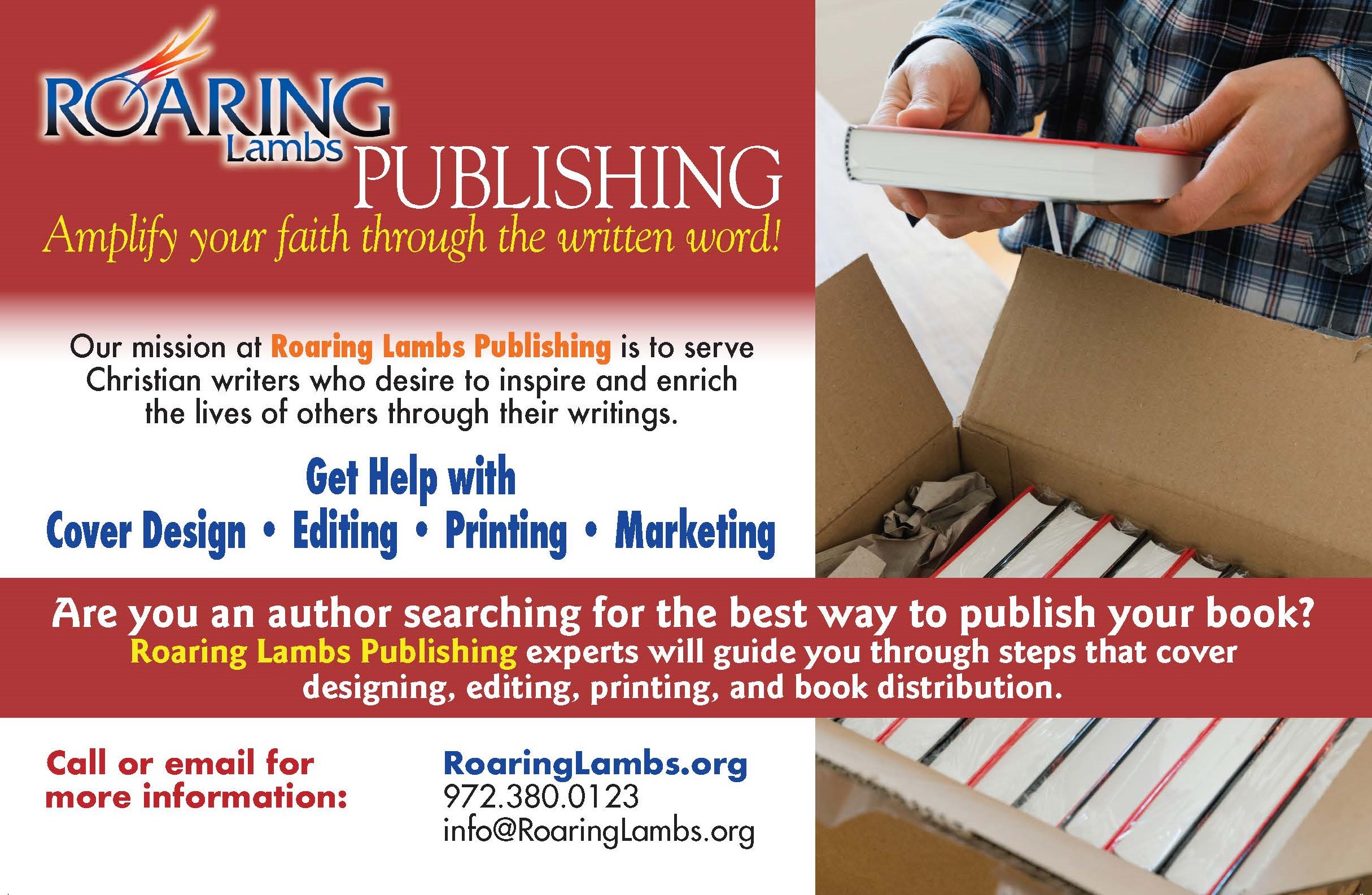 Our mission at Roaring Lambs Publishing is to serve Christian writers who desire to inspire and enrich the lives of others through their books. Our goal is to provide an opportunity to take your message to the world through the written word, thus amplifying your faith in even greater ways.
